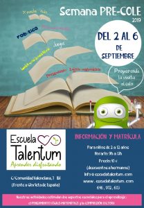 ¡¡Ya tenemos septiembre a la vuelta de la esquina!!Por eso andamos preparando la vuelta al cole.Después de nuestro merecido descanso y aún saboreando los últimos días de vacaciones, os proponemos una semana para poner a punto las neuronas de vuestros chicos.Del 2 al 6 de septiembre os proponemos la SEMANA PRE-COLE.Como ya sabéis que nos gusta “Aprender disfrutando” hemos preparado juegos y actividades muy creativas para trabajar el pensamiento lógico-matemático y la comprensión lectora. Habrá robótica, lectura creativa, yincana, Masterchef, juegos matemáticos, y mucha mucha diversión.Este curso la vuelta al cole será más fácil que nunca.Os esperamos ¡Nos vemos en septiembre!